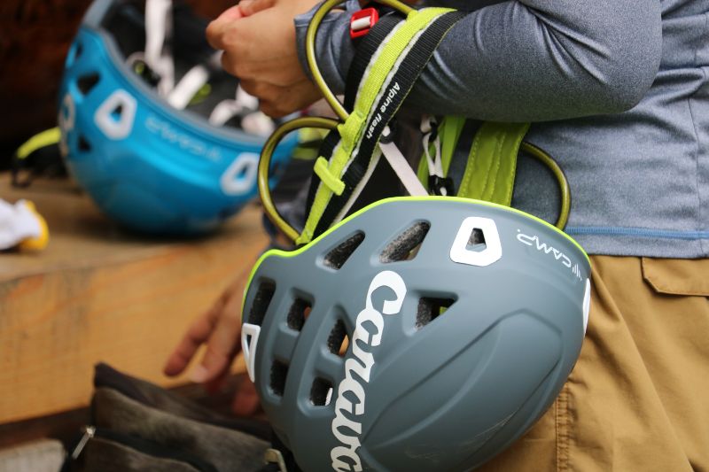 沢登りには絶対欠かせない装備品の1つがヘルメットです。こちらはイタリア老舗ブランドのCAMP(カンプ)、【ストームヘルメット】。ベンチレーション機能を有した22個もの穴がヘルメットに施されていて、通気性が良く蒸れにくい構造となっています。軽量性にも優れていて、後頭部に配置されたアジャスタ―ダイヤルでサイズ調整も瞬時におこなえる、アルパイン仕様のヘルメットです。