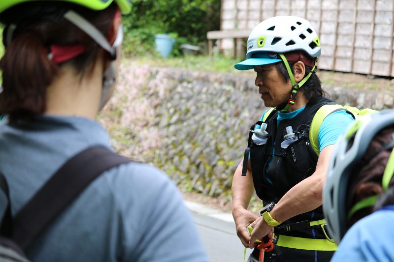 入渓ポイントまで移動後、沢に入る前に装備品が正しく装着できているか、念入りに確認をおこないます。