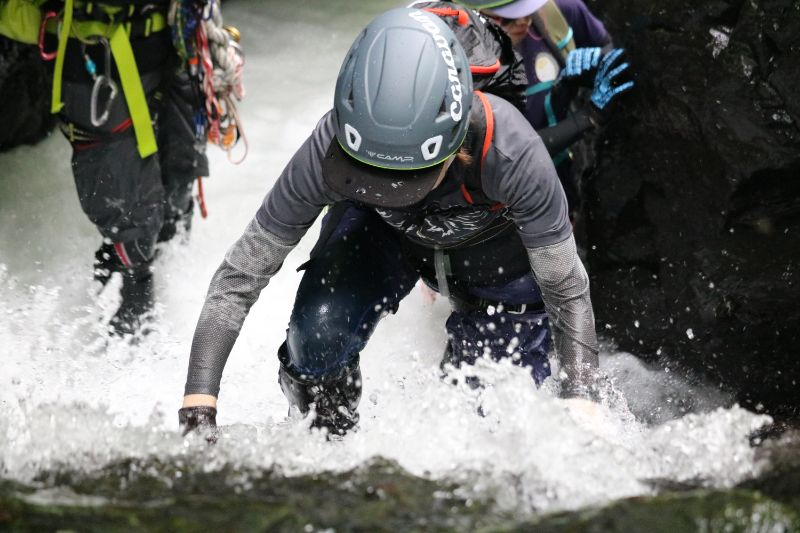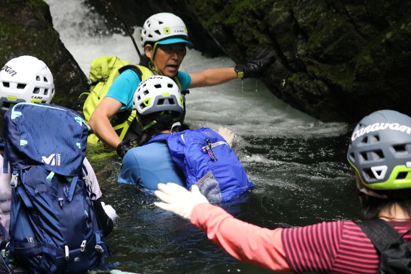 水流に足元が持っていかれないよう踏ん張りながら、参加者を補助する山岳ガイド。沢登りは危険と隣り合わせの行動がどうしても発生してしまいます。だからこそ、キャラバンの体験講習会では経験豊富なガイドの方々やサポートスタッフ陣で構成され、しっかりとしたフォロー体制のうえで行われています。