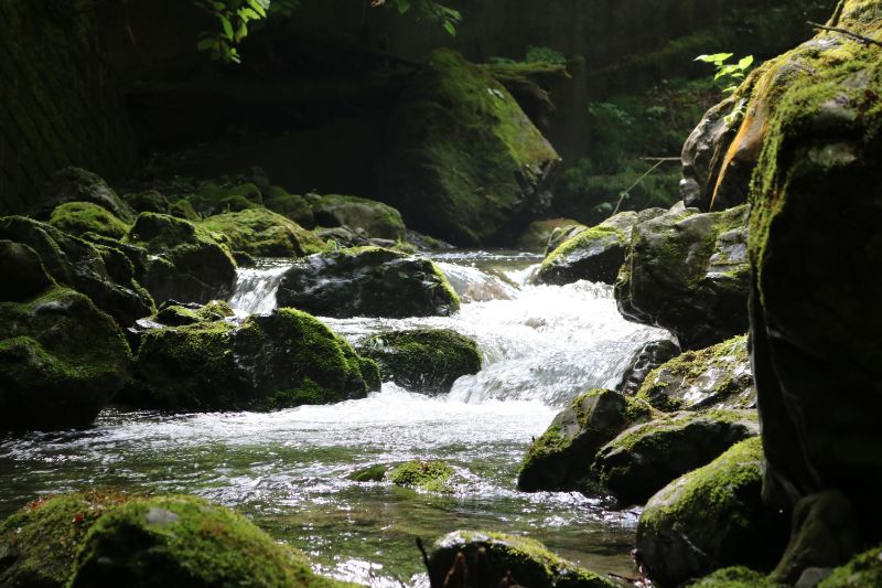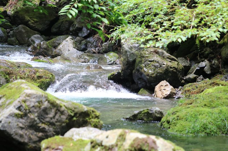 木々の間から陽射しが差し込み光り輝く水面と苔が見られるのは、その場所に足を踏み入れた私たちだけの特権なのかもしれません。