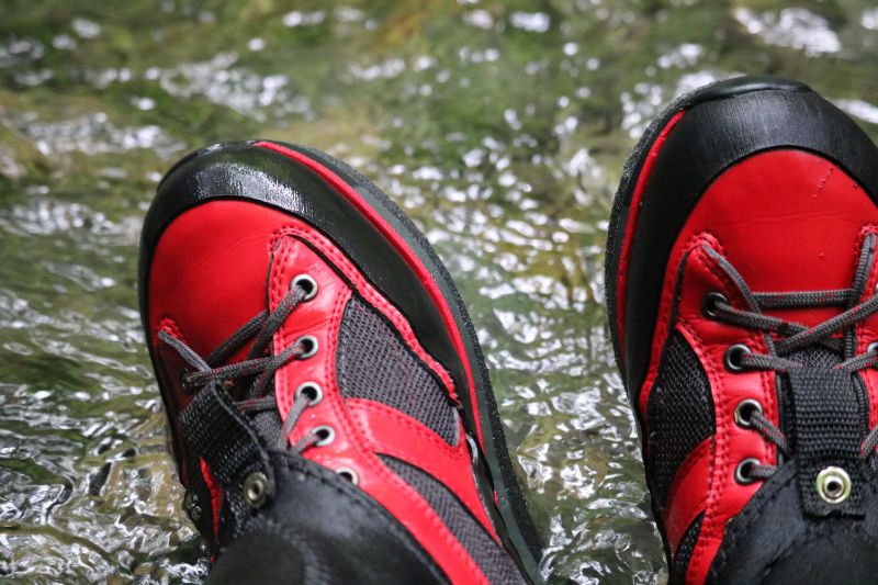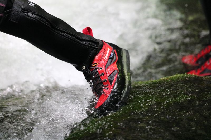皆さんの登る姿をカメラで追いながら、自分の足元も撮ってみました。ちなみに愛用の渓流シューズは、参加者の皆さんが履いているものと同じ『KR_3XF』。水に濡れると、さらに色濃くビビットなレッドカラーがお気に入りです。