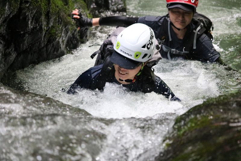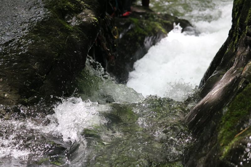 入渓まもなく、胸元までの深さがある場所が現れました。前方からは水しぶきを上げながら、沢幅が狭まり水流が勢いよく流れています。流れに押し戻されないよう踏ん張りながら、岩に取りつき前へと進みます。