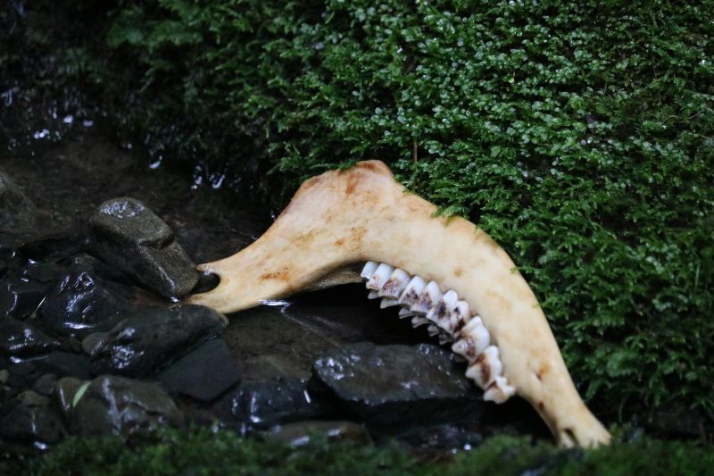 突如出現した骨。鹿の左下顎骨のようです。一見すると清流のように綺麗に見える沢水ですが、このように自然に返る様々なものが沢の中には存在しているので、むやみに沢水を飲むのは控えましょう。