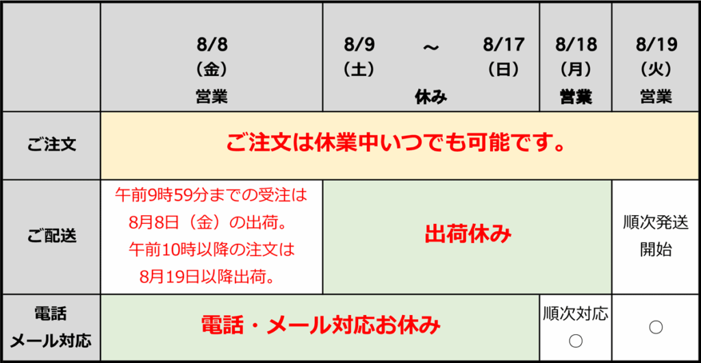 令和7年8月8日(金)午前10時までの受注は8月8日(金)に出荷いたします。