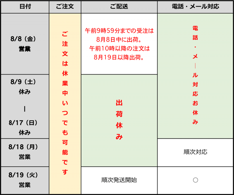 また、8月21日(木)の午前10時以降のご注文に関しましては、8月25日(月)より順次出荷いたします。