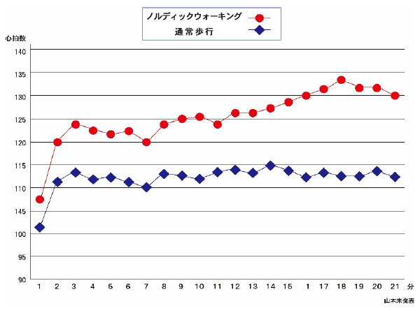 • ノルディックウォーキングと通常歩行で同じスピードで同時に歩き、心拍数を比較