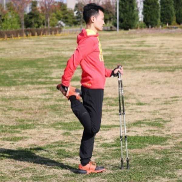直立し、片方の手でポールを握ってバランスを取り、もう片方の手でつま先を持ち、後ろへ引き上げて大腿直筋(太腿)を伸ばします。左右の足を交互に。