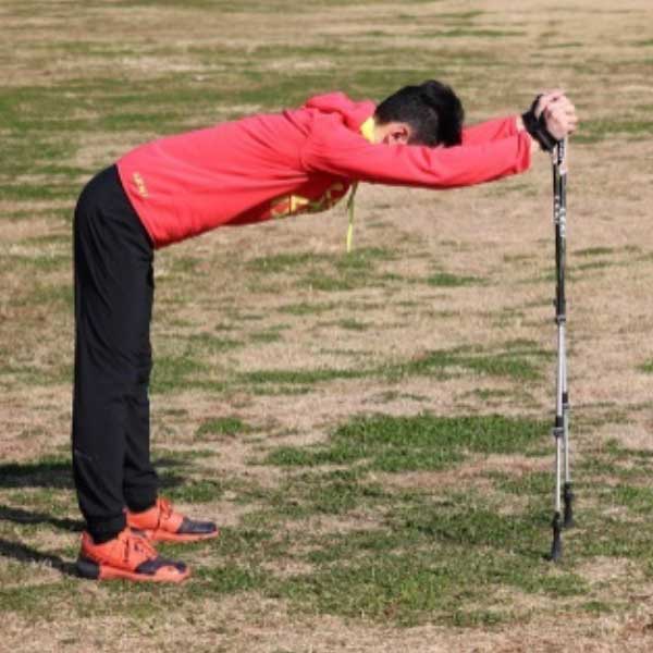 ポールシャフトがしっかりと固定されているかを確認してください。ポールを身体の前方に突き、両手をグリップの上に置きます。背中が真っ直ぐに述べるくらいにポールと身体の距離を取り、背中を伸ばします。