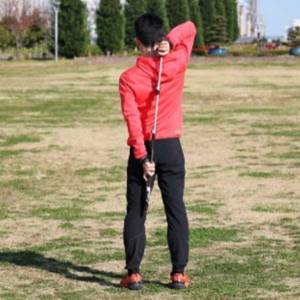 グリップ上部を持ちポールを背中側へ回します。(注:ポールが周囲の人に当たらないように確認しながら)もう片方の手で握り、下方向へ引いて二の腕を伸ばします。左右の腕を交互に。