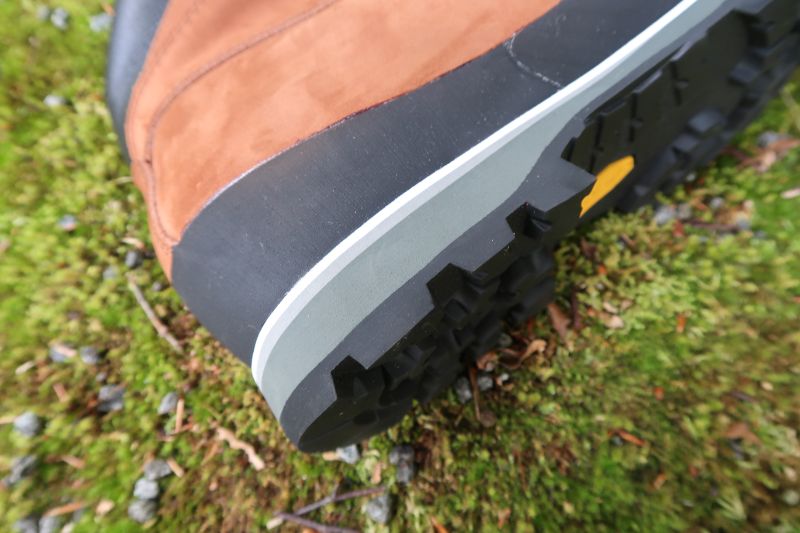 アッパーには2.0mmという厚みのある上質なヌバックレザーを全面的に使い、足首をしっかりと守るハイカットの構造。つま先も硬いラバーで覆われている。全体的に頑強な作りだ。片足で約705gとあまり軽いシューズではないが、この強度を実現するには必要な重さだと考えたほうがいい。