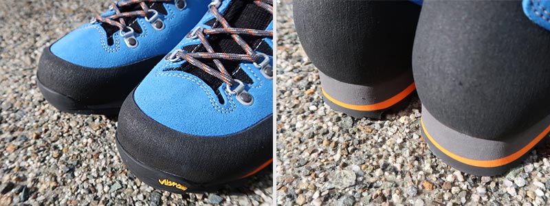 つま先は軽量ラバーで覆われ、強化されている。多くの登山靴はこの部分に厚みのあるラバーを使っていることが多く、そのために強靭にはなるが、重量増の一因ともなっている。