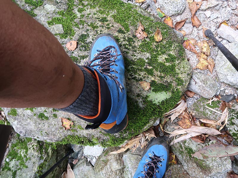 とはいえ、岩場に弱いわけではない。クライミングのようなシチュエーションはともかく、北アルプスの稜線のような岩ばかりの場所でも、接地場所が乾いていればスリップなく歩けるのである。