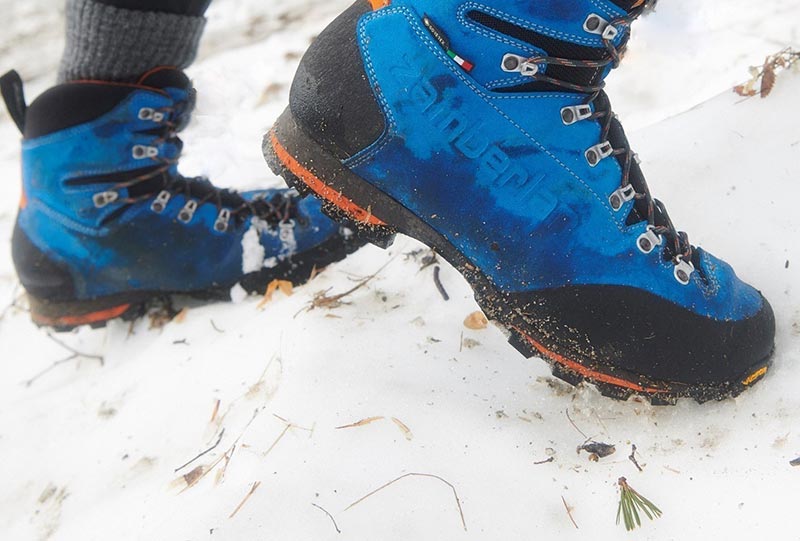 バルトロライト GTはアウトソールとアッパーが柔らかいので、つま先で雪を蹴りこんで歩くような場面には適していない。滑りやすいうえに、足に大きな負担がかかってしまうのである。残雪の上で使用するような場合は、アイゼン類やチェーンスパイクを併用したほうが快適で安全性の向上にもつながる。