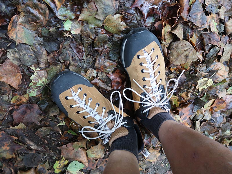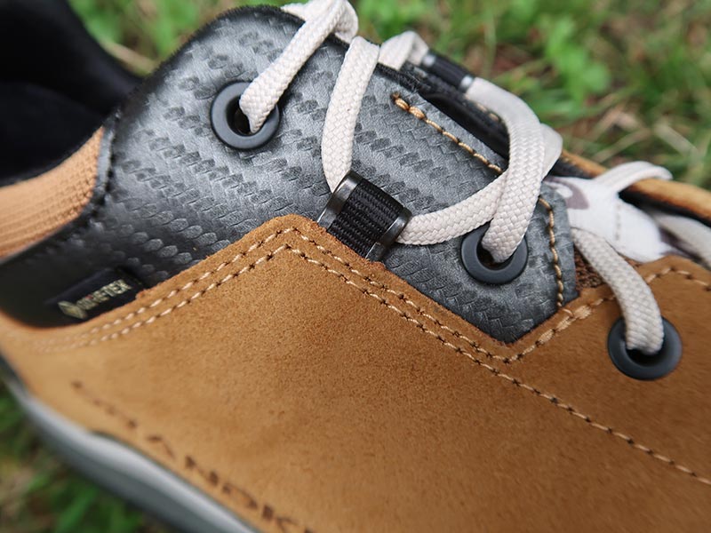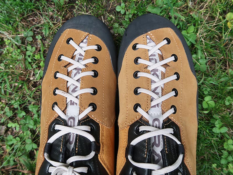 蹴りだす際に足指の部分が程よく屈曲するように、登り道ではほんの気持ちだけ緩めにシューレースを締めていたが、足がズレやすい下りではしっかりと絞って履きたいと考え、下山開始前に改めて調整したときのカットというわけである。このときもハトメとパイプ状パーツのコンビネーションのおかげで、簡単に程よいフィット感を得ることができた。