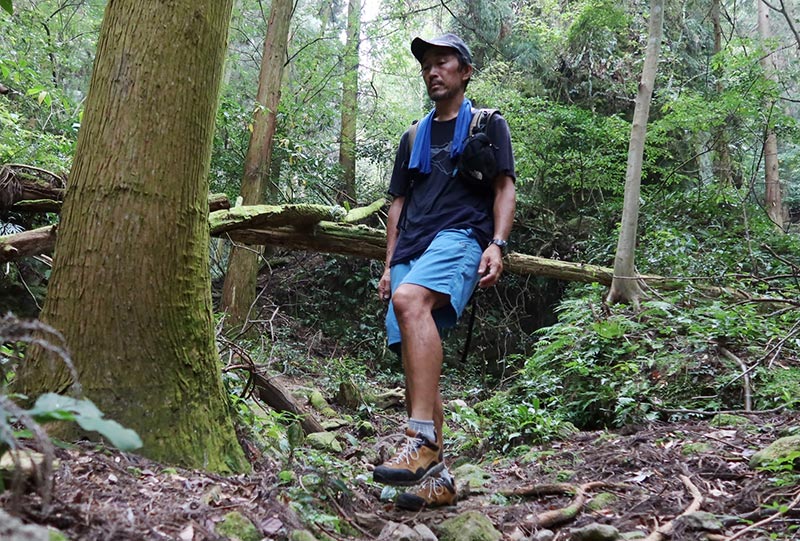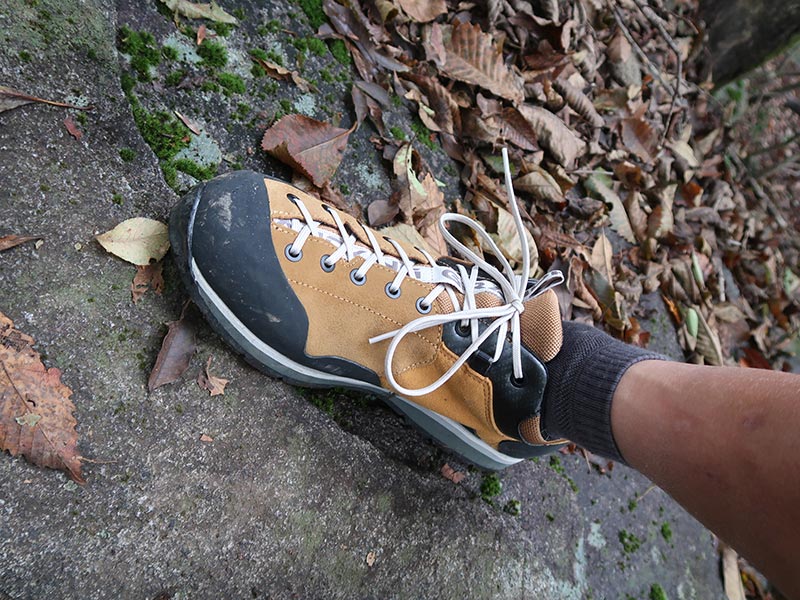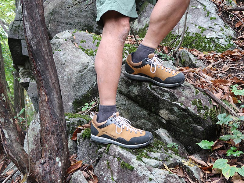 アウトソールが柔らかいトレッキングシューズはこの部分の凹凸が少ないこともあり、こういう足の着き方をすると少々滑りやすいが、「GK26」にはそんな心配が少なかった。