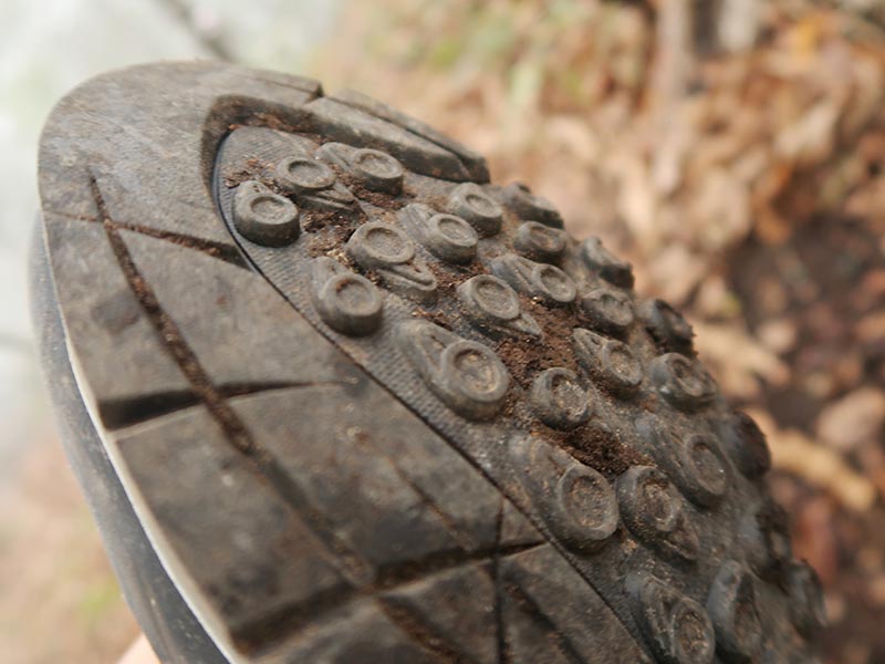 しかし、アウトソールのブロックパターンの凹凸が深いトレッキングシューズに比べると、「GK26」のアウトソールは土を噛む力があまり高くはない。