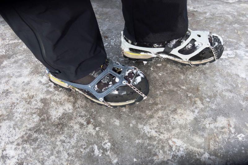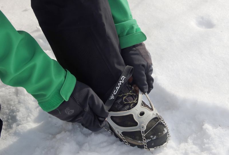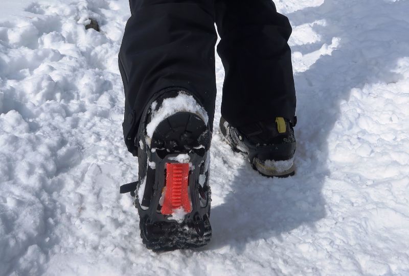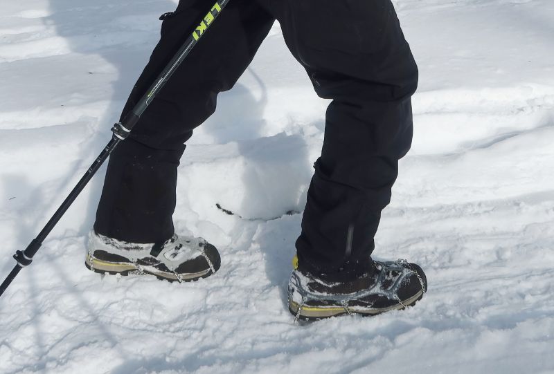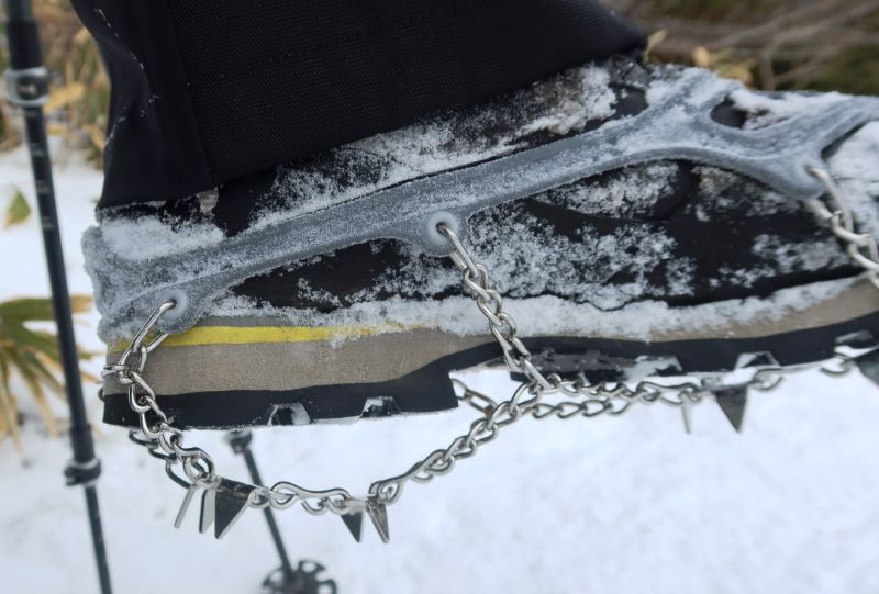 雪山初心者は初めのうちは爪の数が多いクランポンを使わず、まずはこんなチェーンスパイクで低山を歩き、冬期登山に慣れていくのもいい。