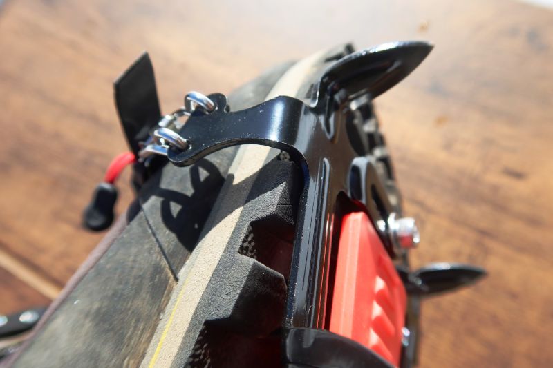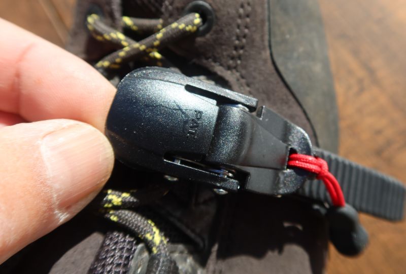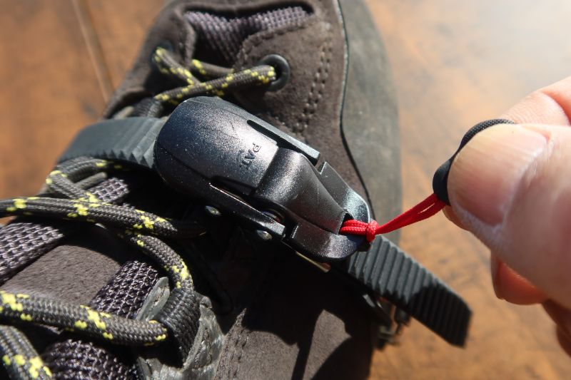 かかとを合わせてからラチェットを登山靴にかけ、赤いコードで右側のレバーを引けばカチカチという音とともにラチェットが締まり、簡単にフィット感が強まっていく。