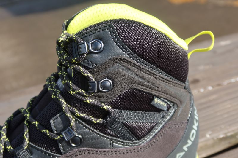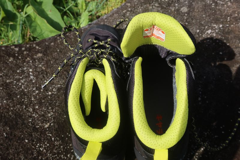 内側のイエローの部分は、クッション性に優れた素材を包み込んだソフトなメッシュ素材。足当たりは柔らかで、吸湿性や通気性が高いのも長所である。GK88は硬めの登山靴だが、この部分のクッション性が高く、柔らかで優しい素材のため、歩行中に足首部分へ痛みを感じるようなことは少ないのだ。