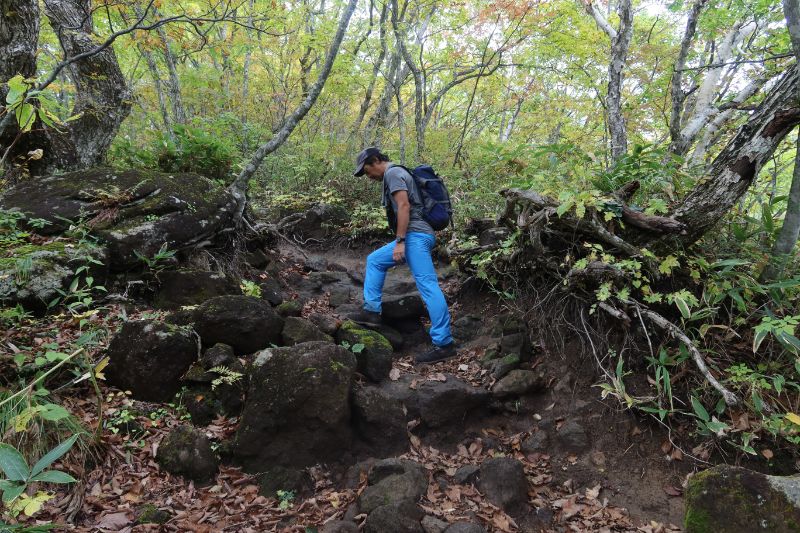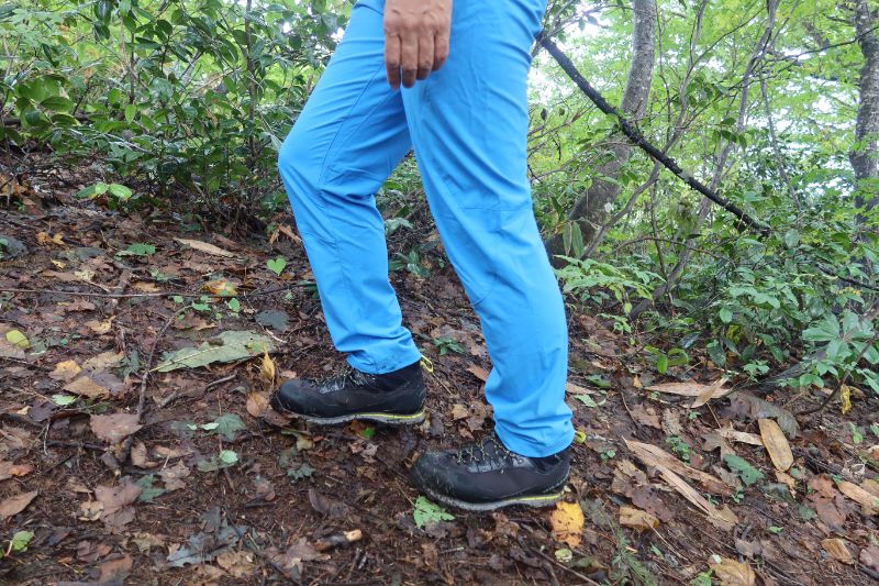 土や落ち葉が主体の登山道を進んでいると、当初感じたのはGK88の硬さだ。おそらくアッパーとシャンク(シューズ内部で足裏に位置する芯材)が硬いために屈曲性が低く、はっきり言えば歩きにくいのである。正直なことを言えば、この時点ではこの登山靴は ” イマイチかもしれない…… ” と、僕は不安にかられていた。