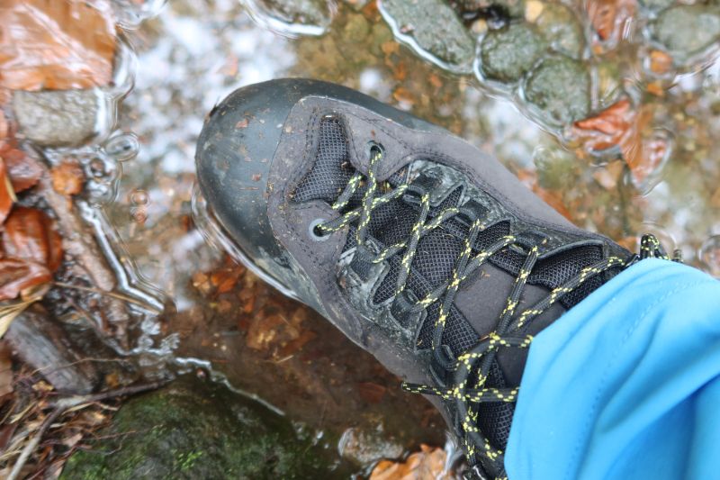 GK88の内側にはゴアテックスが張られており、防水性も上々だ。テスト中に雨はなかったが、沢を渡るときにはあえて水に浸けてみたが、少々冷たさは感じるものの、浸水があるはずもない。