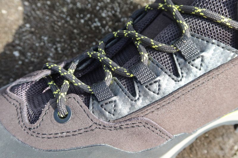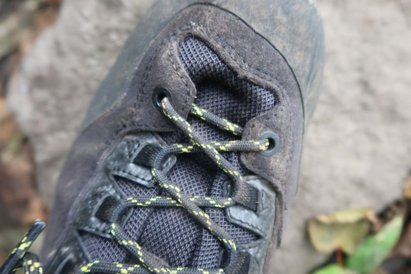 GK88には部位に合わせて数種類の素材が使い分けられているが、メイン素材は柔らかなメッシュポリエステル。その上に硬い合成皮革、スウェードレザーのパネルを張り合わせ、履きやすさと耐久性を両立させている。登山経験者ならば足を入れて少し歩いて見るだけで、トレッキングタイプよりは硬いが、ライトアルパインタイプほど硬いわけでもないという履き心地を実感してもらえるに違いない。