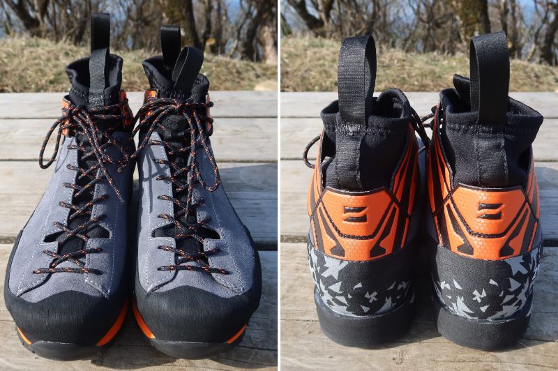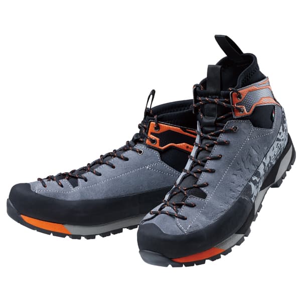その外観はミッドカットのアプローチシューズに近く、アッパーのグレーの部分は丈夫なハイドロブロック・スウェードレザーである。