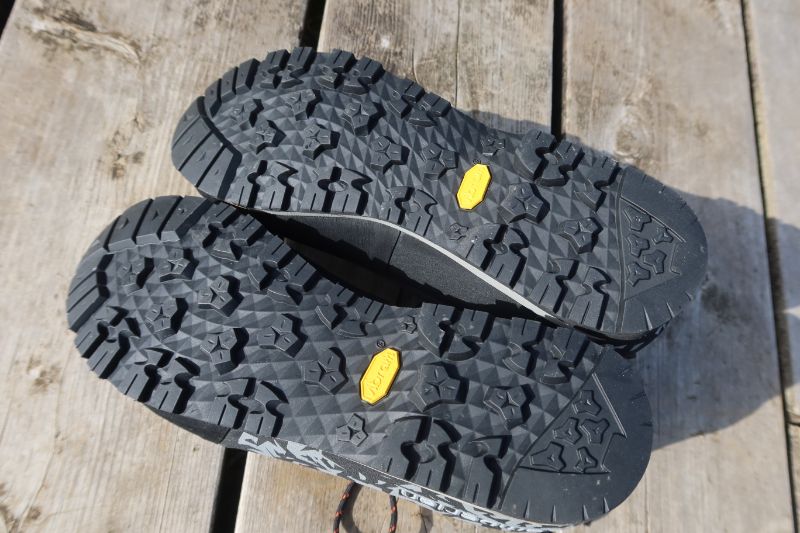 ミッドソール同様、アウトソールもかなり薄い設計になっている。登山用のシューズとしては、ちょっと珍しいくらいである。これは “ ヴィブラムPepe ” というアウトソールで、厚みを抑えることによって軽量化を最大限に考えられて考案されたものだという。