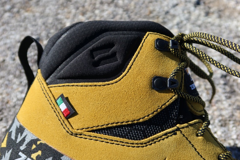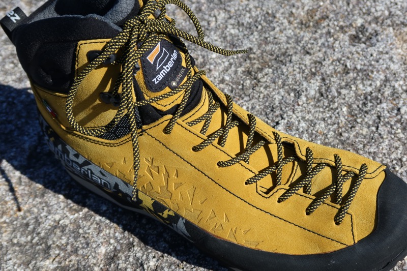 サラテ トレック GT RRに使用されているメイン素材は、防水性に優れたハイドロブロック・スエードレザーで、厚みは1.6~1.8㎜。一見では硬そうな素材感だが、じつは非常に柔らかだ。そして、重量約480g(EUR42片足)と軽量だ。