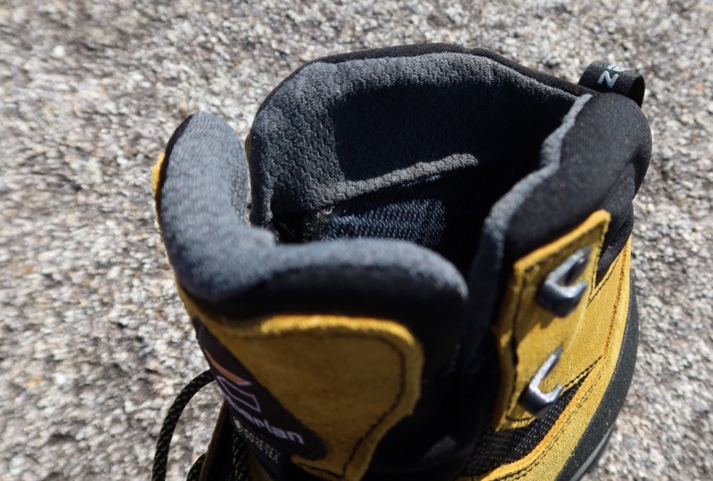 タン全体が一枚のレザーなのではなく、途中で黒い柔らかなクッション性素材に構造パターンを切り返してあり、こんなところでも柔軟性を高めてある。