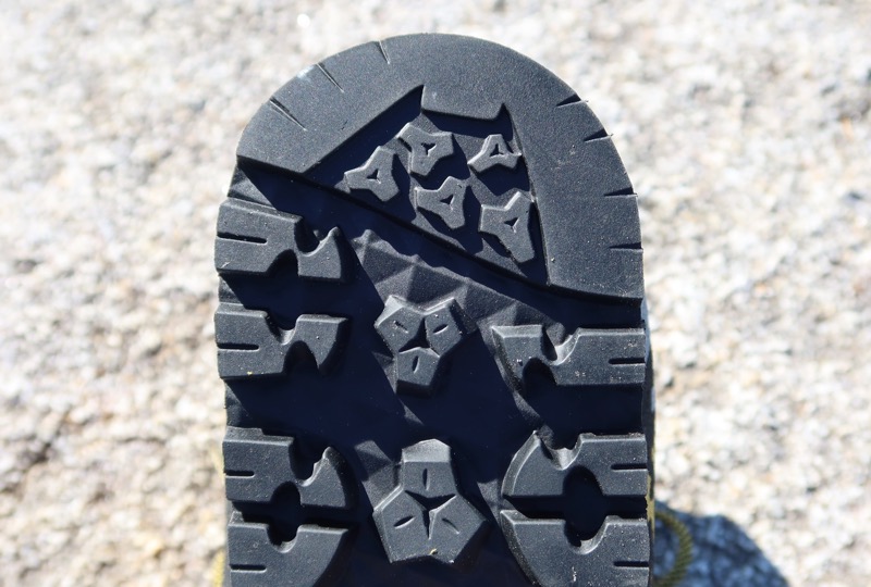 つま先のラグのパターンは平面的で、岩場では細かな凹凸をとらえやすい。