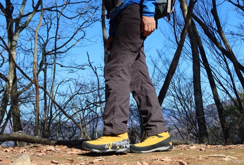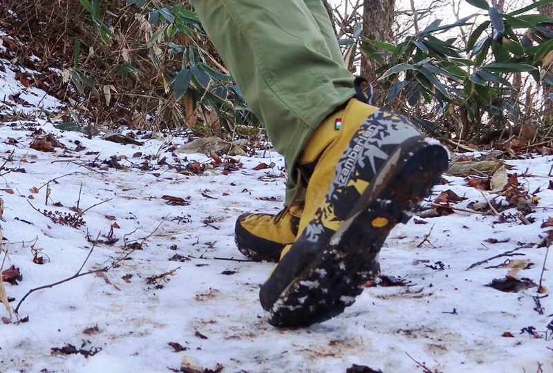 アウトソール全体をベタっと雪の上につけると滑ることもあるが、アウトソールのエッジを効かせて歩くようにすれば、思いのほかグリップして体が止まる。アッパーが薄いので、足先は冷えやすいが、春先にうっすら残る雪の上くらいは行けなくもない。もっとも、ザンバランならばバルトロ ライト GTのようなシューズのほうが残雪の上では活躍するだろうが、状況によってはサラテ トレック GT RRの出番もあり得る。