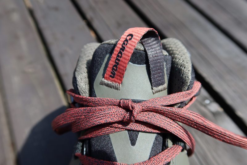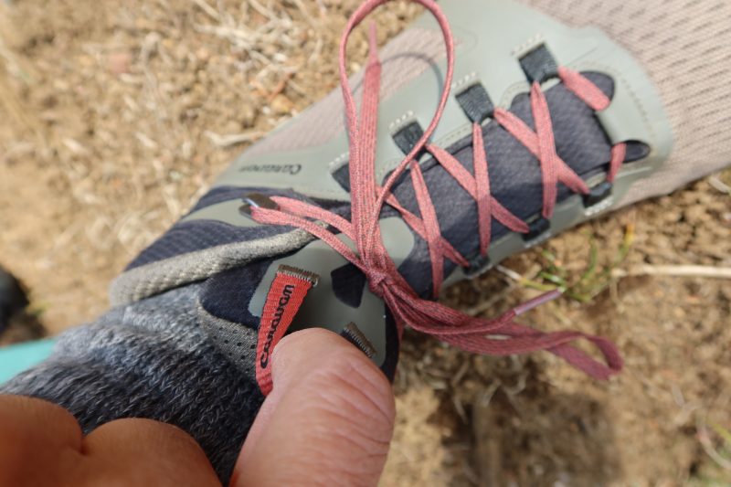 こんな感じでシューズを山中で脱ぎ履きしていると、タンにつけられたループがよい働きをすることにも気づく。