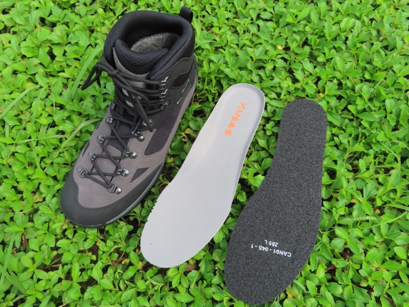 また、GK8X_FFFはクッション性が高いアーチインソールを内蔵している(下の写真のグレーのもの)。これにより、インソール、ミッドソール、アウトソールという3種のコンビネーションで、高度なクッション性を実現している。GK8X_FFFはトレッキングモデルのシューズにしてはかなり頑丈な作りになっているが、それでも履き心地が硬すぎることはなく、クッション性をおろそかにしていないことがわかる。