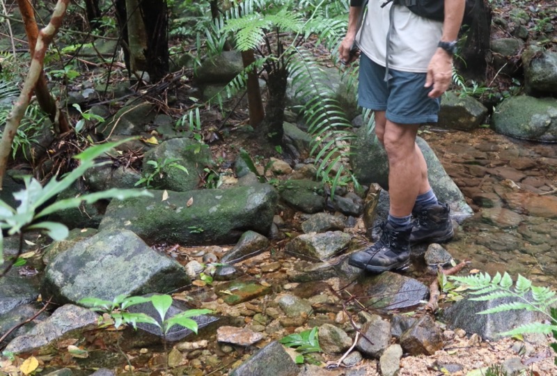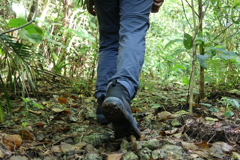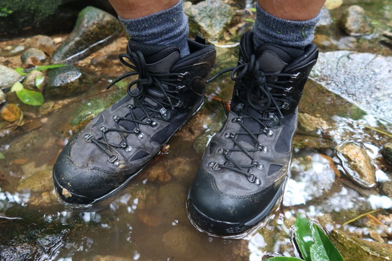 このようにつるっとした石の上でもGK8X_FFFは滑りにくい。とはいえ、足を置くとはがれるような苔が付いていると、さすがに少し滑ることは避けられないのだが、少々滑ったとしても足首まで覆われたアッパーによって捻挫を起こすまでには至らない。