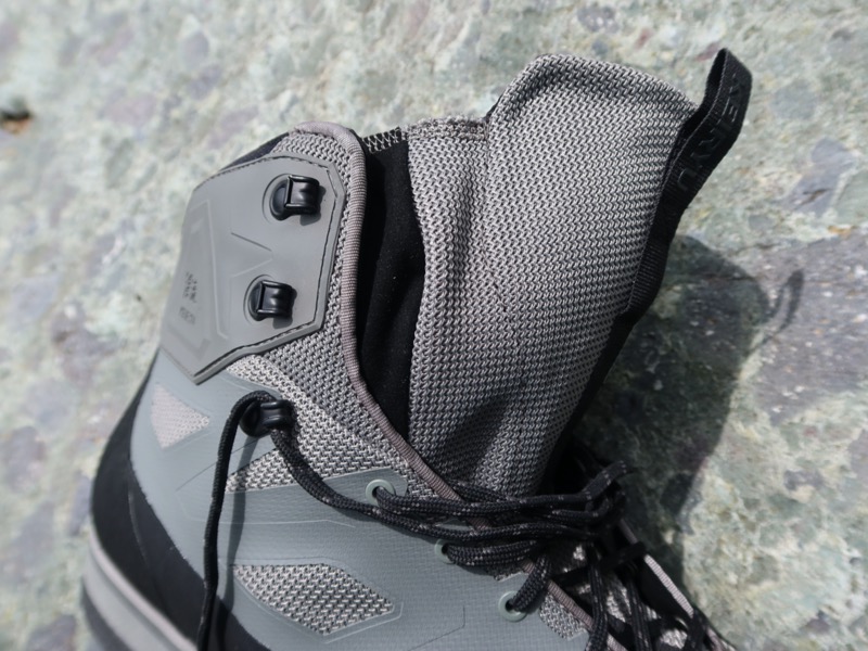 アッパーの最上部にはフックが2段になって使われており、シューレースをすべてハトメを通すタイプの渓流シューズよりも脱ぎ履きがしやすい。