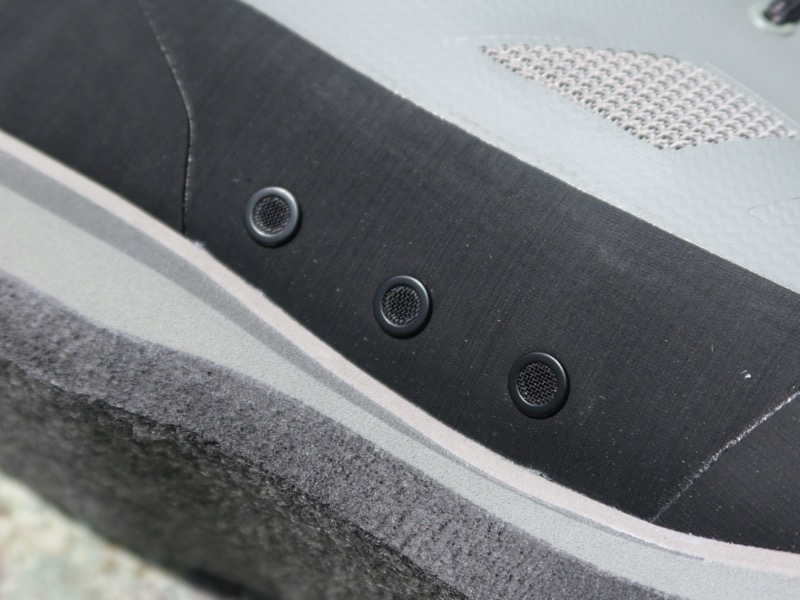 サイドのラバーには小さな孔が3つ並んで付けられ、シューズ内部に入った水はここから排出される。
