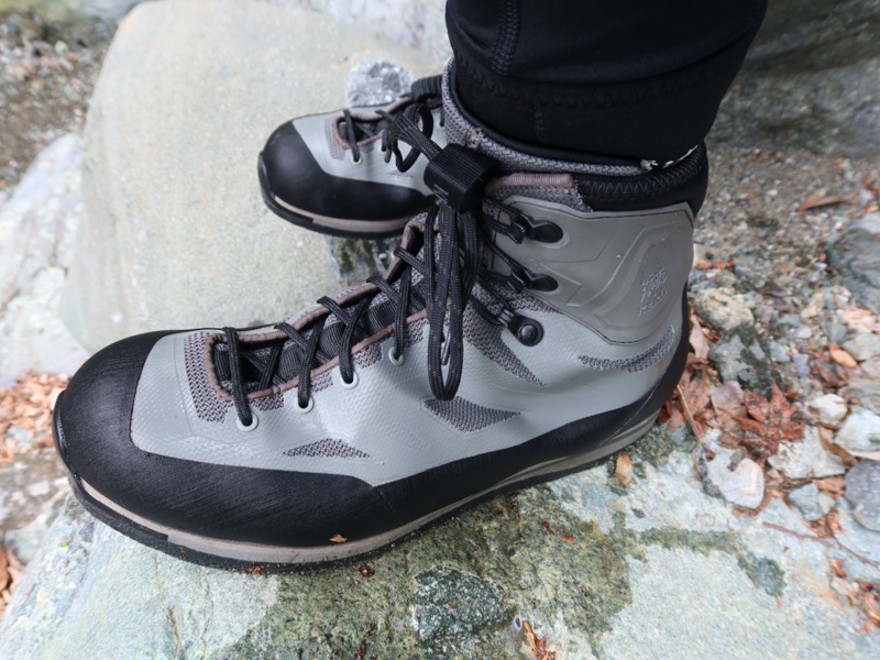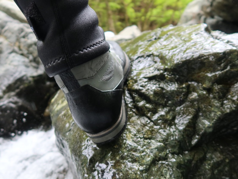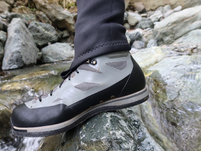上の写真のように丸みを帯びた岩の上へ足を置いたとき、かかとに体重がしっかりと乗り、体が安定しやすいのである。使い続ければフェルトの摩耗によって、この感覚は少しずつ失われていくのかもしれないが、初期性能としてはすばらしい。