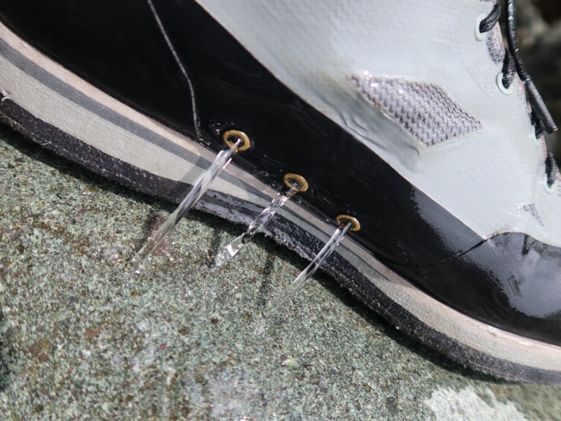 KR_MSF WIDEの水抜けは非常によく、メッシュ製のアッパーはもちろんのこと、サイドの孔からの水の流れ出しも良好。内部に水が溜まって、シューズが重くなることはない。これならば快適に歩くことができ、疲労も少ない。