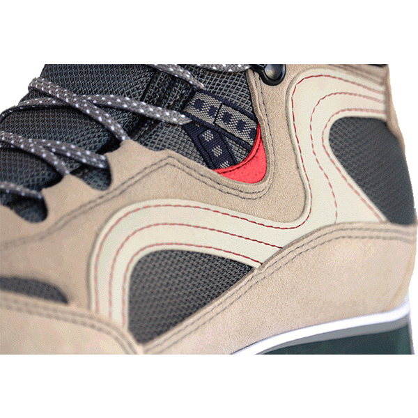屈曲ストレスポイントはテープシューレーシングを採用、フィッテングしやすくしつつも、足首が過度に固定されず、岩稜帯でも歩きやすいようになっています。