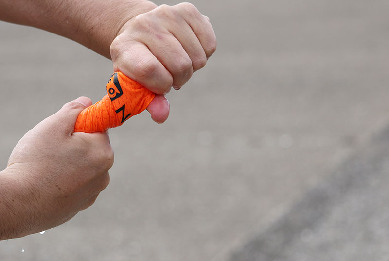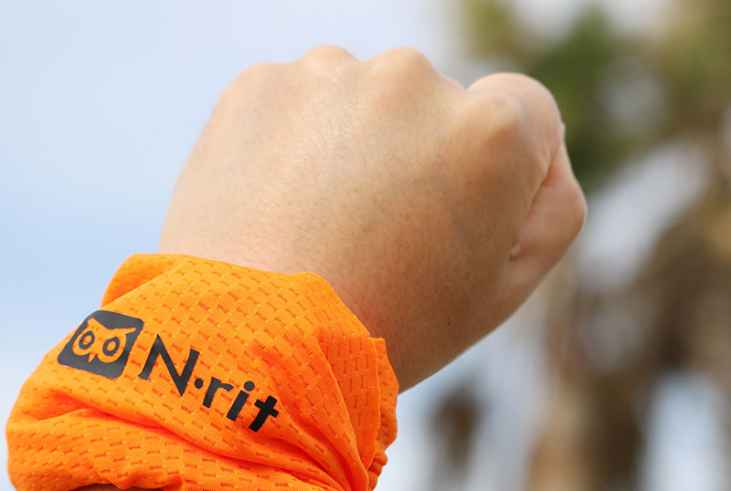 使用しないときはこのようにリストバンドのように手首に巻けば邪魔にもならず、汗を拭う事も出来て便利です。